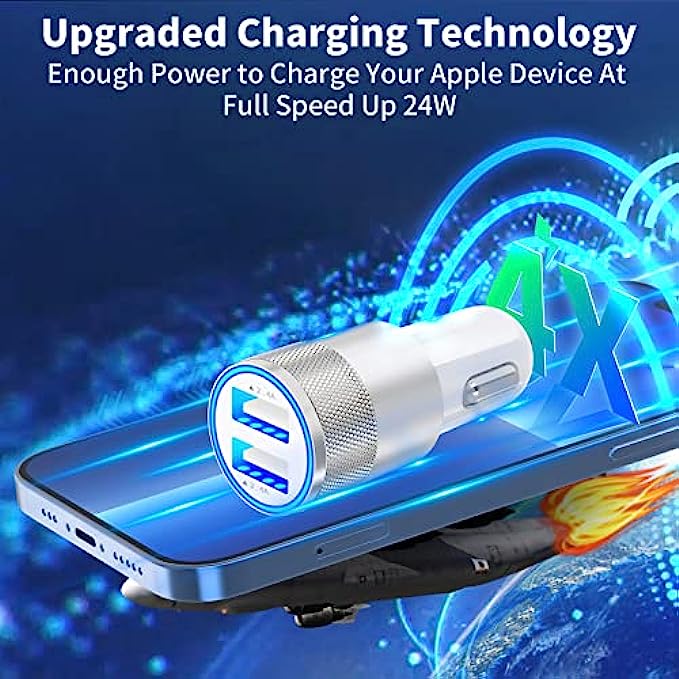 【Dual USB Port Smart Car Charger】: Equipped with Dual USB power output, Braveridge's fast car charger can charging two iPhone devices simultaneously. The built-in intelligent IC chip automatically detects and provides the best power for your iPhone devices. Provide a maximum of 2.4A/12W if a single port is used and 4.8A/24W when dual ports are used simultaneously. Can charge your iPhone device 4 times faster, Charging efficiency is improved by 50%.