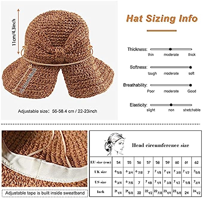 Straw 拉绳 closure Hand Wash Only 【ADJUSTABLE STRAW SUN HAT】- Features with wicking sweat band to keep you cool and comfortable, prevent the sweat dripping in your eyes.Ribbon inside the sun hat can be adjusted for different head size,from small head size to large head size around 22.05-22.83 inches. 【USABLE】- Perfect to use as a beach hat for holidays or as a daily headwear, is very wearable with anything like dress, bikini or shorts for women lady teenagers girls. This sun hat is perfect for camping, hiking, gardening, traveling, fishing, boating, hunting, safari, beach, pool or any other outdoor sport activity. 【Big Wide Brim Beach Hat】- This Beach Straw Hat offer high UV UPF sun protection with full brim, sun blocker function.Wide Brim 4 inches helps to keep both of your head and neck from scorching sun.