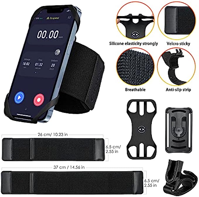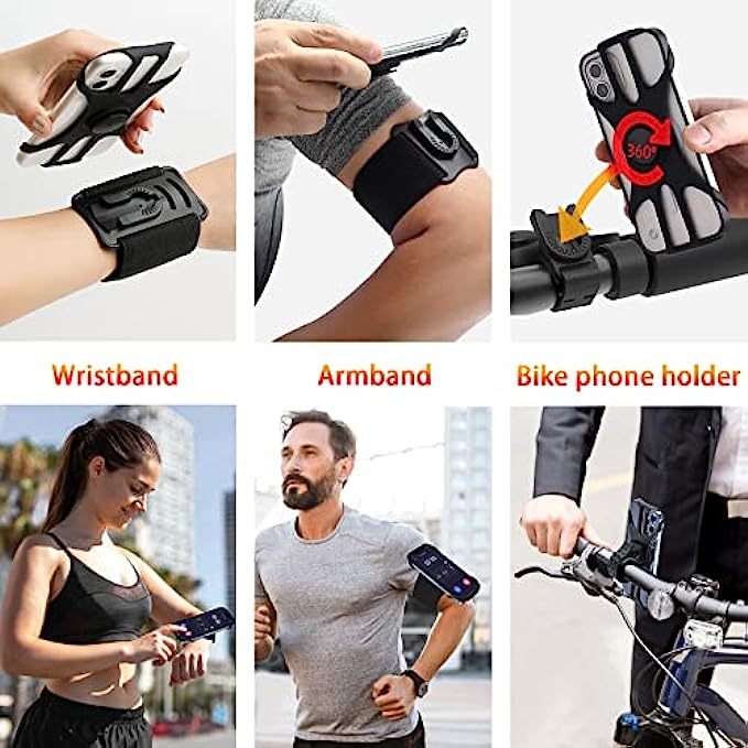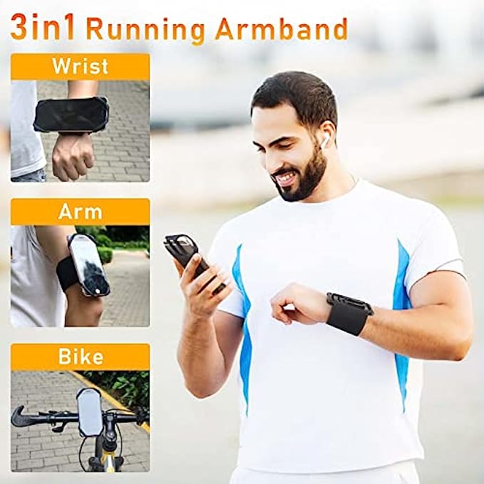 3 in 1 running phone wrist strap & bicycle phone mount. The sports armband for men and women has 3 functional applications, you can use it on your arm, wrist and cycling.