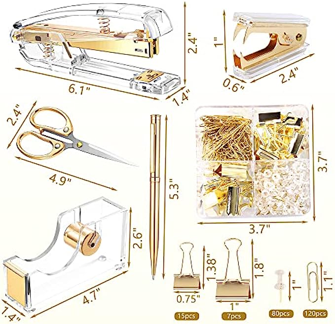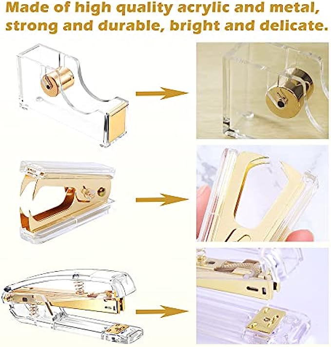 【Material】Stapler, Tape Dispenser and Stapler Remover are mainly made of acrylic and metal, smooth and comfortable to the touch, not easy to break, durable. The color is clear and bright, elegant and beautiful, very suitable for desktop office supplies.