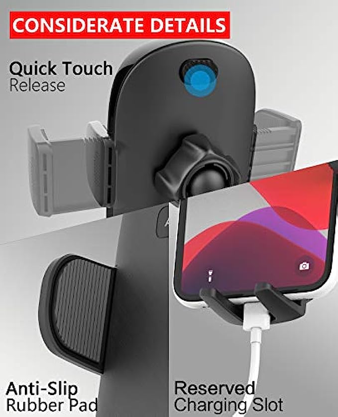 • One-Hand Operation Versatile Phone Car Mount: One press release design, install or remove a smartphone with only one hand. The cup phone holder for car has a foot and two adjustable arms with a silicon pad, it holds the cell phone tightly. The open bottom tray design provides access to effortless charging.