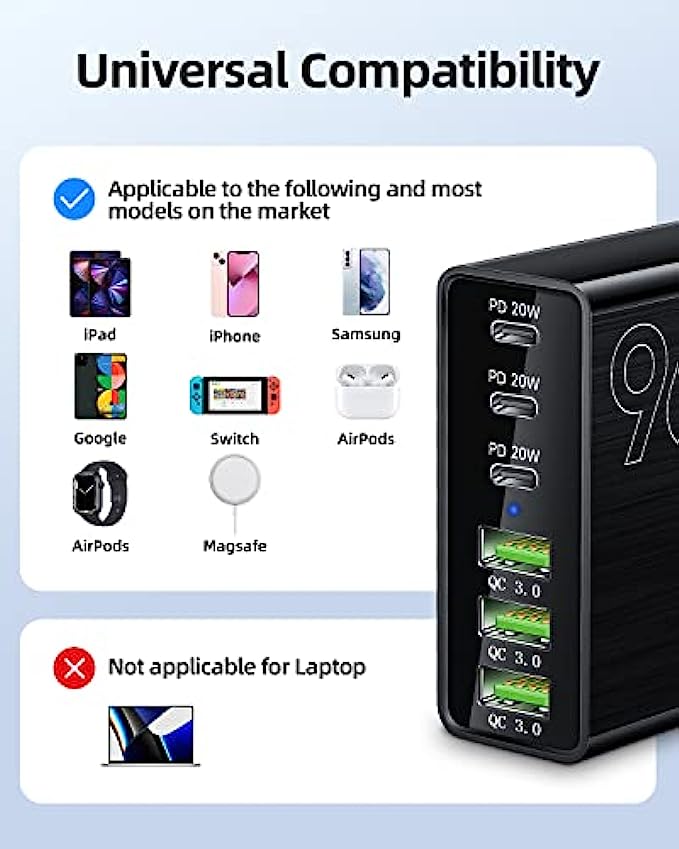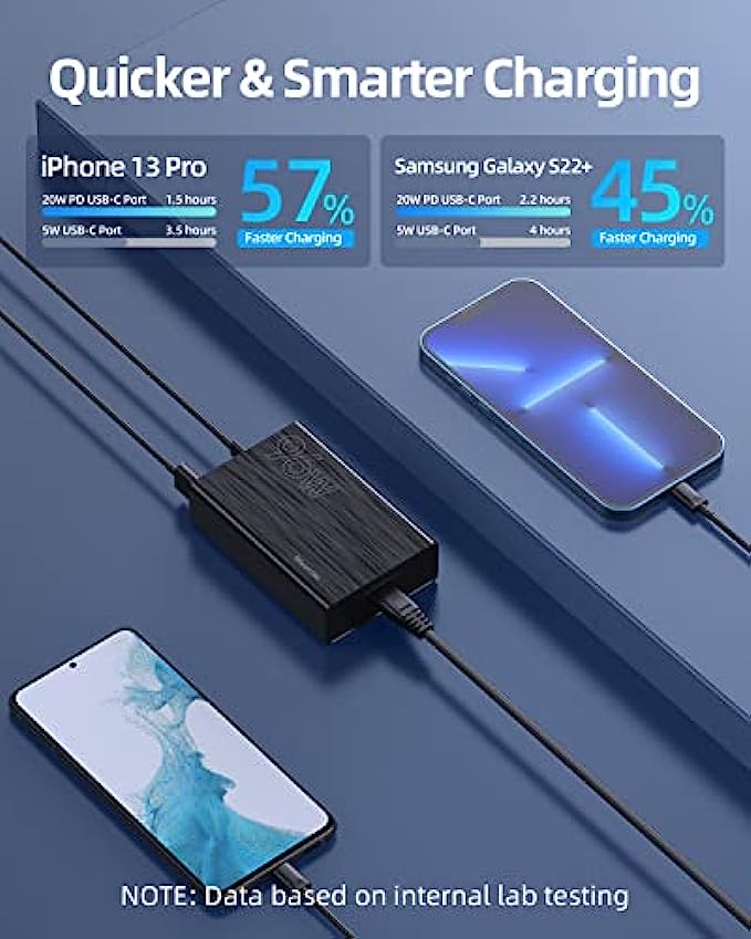 【Universal Compatibility】: Charge virtually all your mobile and tablet devices at maximum speed with USB-C and standard USB input. This multiport USB C wall charger are compatible with iPhone 13/13 Pro/13 Pro Max, iPhone 12/12 Pro/12 Pro Max/, iPad Pro/iPad Air, Samsung Galaxy S22 Ultra/S21 Ultra Series, Pixel 6/5/4a, and More.