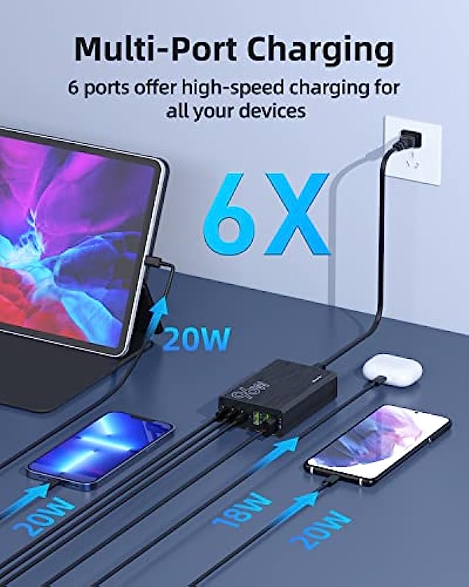 【6 IN 1Fast Charger】Our USB C Wall Charger With 3 USB-C Power Delivery port(each port 20W) and 3 USB-A port(each port 18W), you’re ready to charge six of your devices simultaneously. Automatically detect all connected devices, adjust the output accordingly, ensure a constant voltage to minimize charging time.