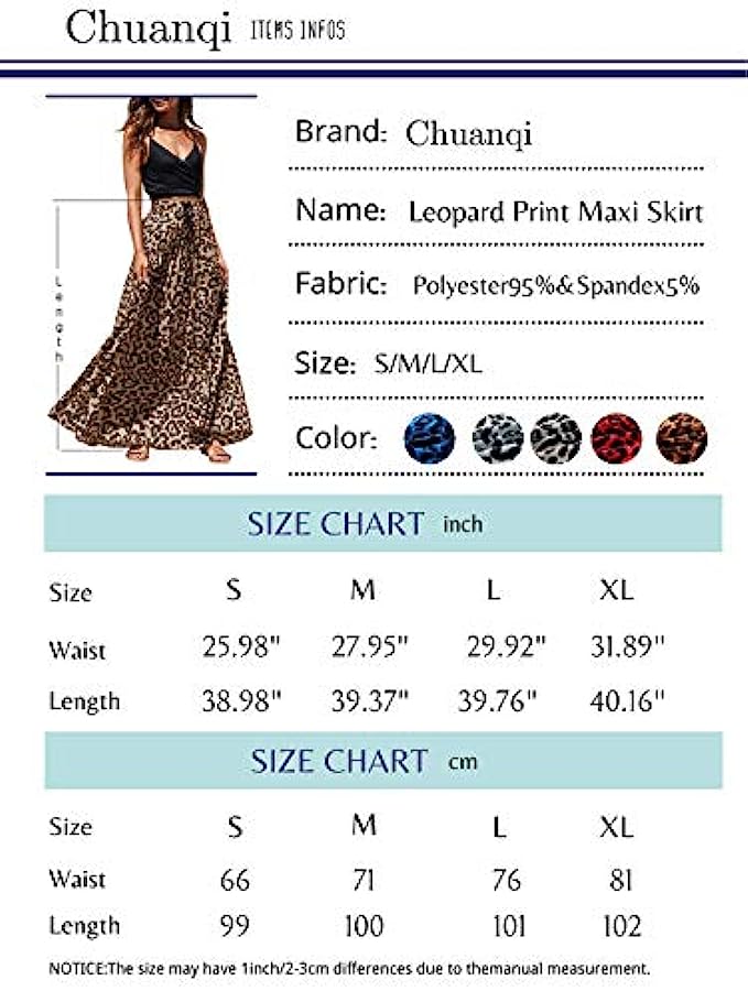 • Features: High rise, elastic waist, with drawstring, pleated, flowy and flared, a line, floor length long skirt, leopard print maxi skirt.